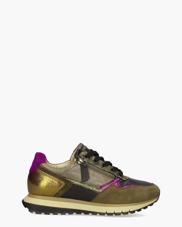 Opvallende damessneakers 56.378.63 uit de Comfortlijn van Gabor. Deze schoen is vervaardigd van verschillende materialen zoals suède, (metallic) leer en printleer in groen, goud, zwart en paars. Het binnenwerk, inclusief een uitneembaar voetbed, is uitgevoerd in stof en leer. De ritsjes maken het aan- en uittrekken van de sneakers