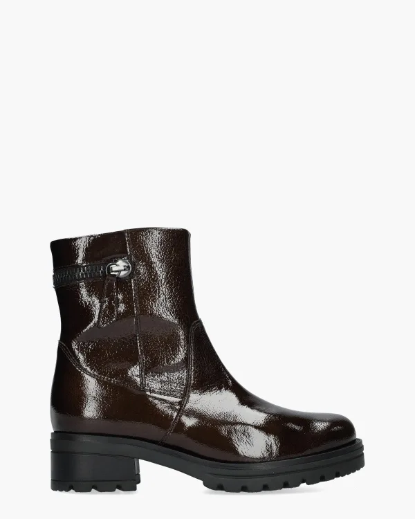 De Gabor 72.780.84 dames enkelboot straalt elegantie uit dankzij het glanzende lakleer in diep donkerbruin. De 15,5 cm hoge schacht is afgewerkt met een subtiel decoratief riempje. De microvezel voering voelt zacht aan en het vaste voetbed biedt comfortabele ondersteuning. De stevige rubberen profielzool en 5 cm blokhak zorgen voor gripén