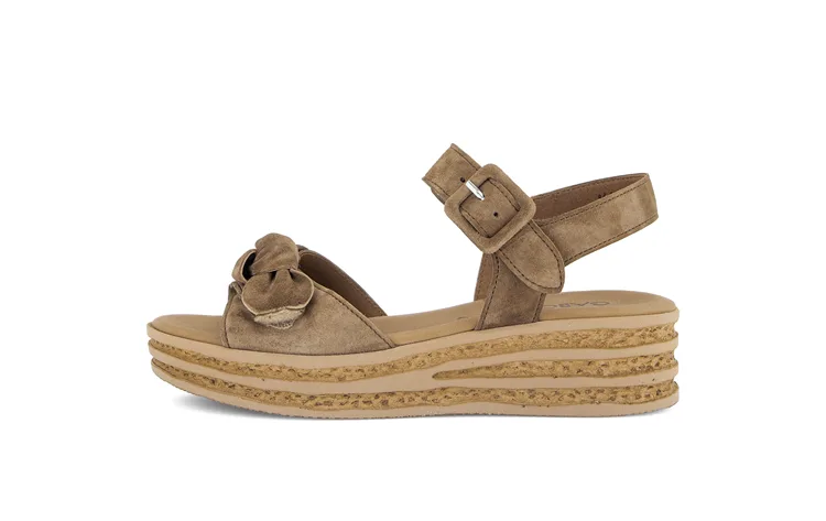 Gabor 84.553.18 - Plateau Sandaal met Strikdetail in TaupeZet een stijlvolle stap in het nieuwe seizoen met deze prachtige sandaal van Gabor. Uitgevoerd in een tijdloze taupe-kleurige suède, combineert dit model moeiteloos een romantische uitstraling met een modern, stoer silhouet. De opvallende plateauzool met kurk-look accenten geeft u net dat beetje extra lengte zonder in te leveren op loopcomfort.De highlights van dit model:Materiaal: Vervaardigd uit hoogwaardig, fluweelzacht suède.Vrouwelijk Design: De voorband is versierd met een sierlijk strikdetail, wat de sandaal een charmante en verfijnde look geeft.Plateauzool: Een modieuze zool met een gelaagde structuur die zorgt voor een goede demping en een trendy zomerse uitstraling.Verstelbaar: Voorzien van een handige gespsluiting bij de enkel, zodat de sandaal altijd stevig en comfortabel om uw voet sluit.Voetbed: Het zachte, gevoerde voetbed biedt optimaal draaggemak, zelfs tijdens een lange zomerse dag. Comfortabel en VeelzijdigOf u nu een zomerse bruiloft heeft, een dagje gaat flaneren op de boulevard of een terrasje pakt in de stad; deze Gabor sandaal is uw ideale metgezel. De neutrale kleur past perfect bij een luchtige maxi-jurk, maar staat ook fantastisch onder een casual jeans met opgerolde pijpen.Tip van onze stylist: De plateauzool compenseert de hoogte van de hak, waardoor u profiteert van de uitstraling van een hak met het comfort van een platte schoen.