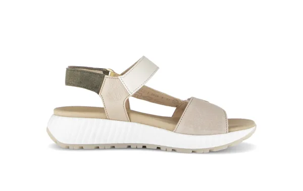 Gabor 84.582.11 - Sportieve Sandaal in Beige & MultiDeze sandaal uit de collectie van Gabor is de perfecte combinatie van een trendy design en sportief loopcomfort. Door het gebruik van verschillende zachte tinten zoals beige, lichtgeel en olijfgroen, krijgt de sandaal een frisse en eigentijdse uitstraling. De opvallende dikke witte zool met grof profiel geeft het model een krachtig silhouet dat perfect past bij een actieve zomerstijl.De highlights van dit model:Materiaalmix: Een hoogwaardige combinatie van soepel suède en leer in harmonieuze natuurlijke tinten.Design: Voorzien van een luxe goudkleurig detail op de voorste band voor een verfijnde touch.Optimale Verstelbaarheid: Uitgerust met twee klittenbandsluitingen (op de wreef en bij de hiel), waardoor de sandaal eenvoudig en nauwkeurig aan uw voet kan worden aangepast.Zool: Een lichtgewicht, witte 'chunky' zool die zorgt voor maximale demping en een sportieve look.Voetbed: Het ergonomisch gevormde voetbed is zacht gevoerd, wat zorgt voor urenlang loopplezier zonder vermoeide voeten. Sportief en VeelzijdigOf u nu een stevige stadswandeling maakt of een dagje naar het strand gaat, deze Gabor sandaal biedt de stabiliteit en grip die u nodig heeft. De combinatie van neutrale kleuren met een subtiele gele 'pop of color' maakt het een item dat makkelijk te stylen is met zowel een jeans als een sportieve zomerjurk.Tip van onze specialist: De brede banden bieden extra stevigheid rondom de voet, wat dit model ook zeer geschikt maakt voor dames die wat meer ondersteuning zoeken in een open schoen.