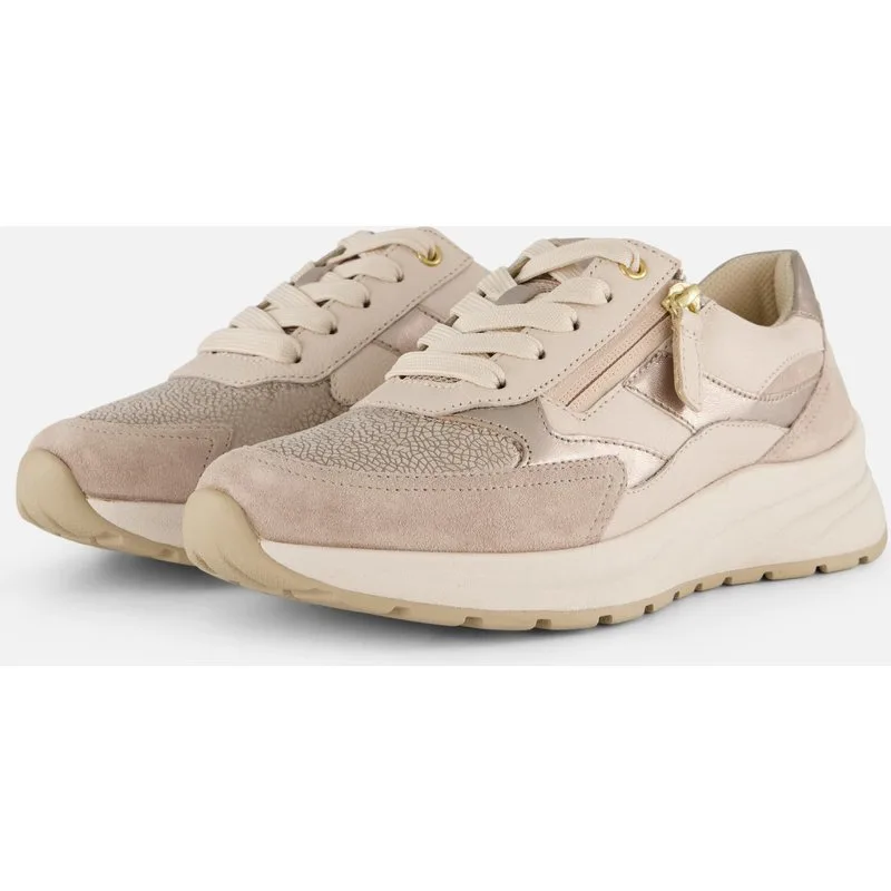 Deze Gabor sneakers in beige zijn stijlvolle dames sneakers met een comfortabele K-leest. De subtiele goudkleurige glans zorgen voor een modieuze uitstraling. Het synthetische bovenwerk en de textiele voering bieden prettig comfort. De uitneembare leren binnenzool en de rubberen loopzool van 2 centimeter zorgen voor goede ondersteuning en maken de schoen dankzij rits en veters makkelijk aan te schieten.