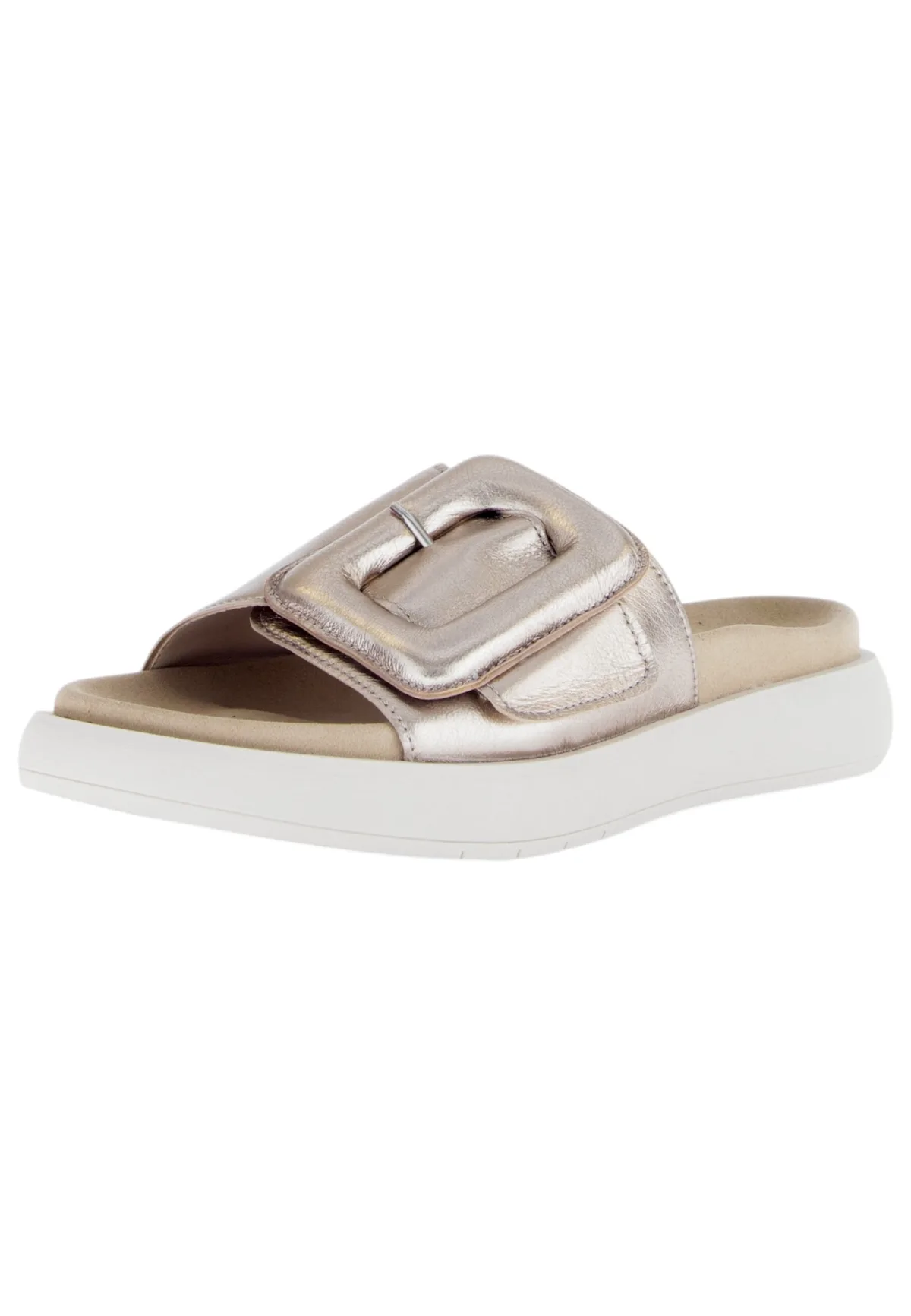 Design: Anatomisch gevormd voetbed; Type sluiting: Slip; Materiaal: Leer; Motief: Effen; Plateau: Met plateau; Materiaal: Lak; Schoenneus: Open toe; Extra's: Metallic look; Hakhoogte: Platte hak (0-3 cm)