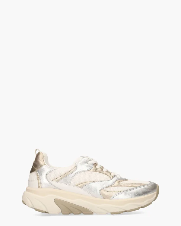 Deze Gabor Rollingsoft 66.936.83 damessneaker in zilver en wit met gouden accenten combineert sportieve elegantie met optimaal comfort. Het metallic leer geeft de sneakers een luxe uitstraling en een fijne pasvorm, terwijl de sporty mesh accenten het design verfijnen. Het innovatieve Rolling Soft-systeem biedt maximale stabiliteit en