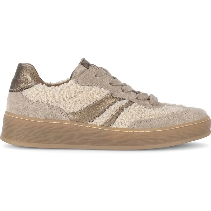 Deze sneakers van Gabor combineren leer en textiel met een zachte teddy-look voor een stijlvolle, comfortabele uitstraling. Ze zijn voorzien van een uitneembaar voetbed en sluiten met veters. Dankzij de rustige beige tinten zijn ze moeiteloos te combineren, terwijl de stevige rubberen zool zorgt voor goede grip.