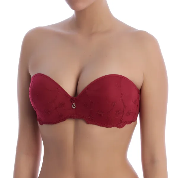 Strapless bh voor bruiden, ontworpen met beugel en gewatteerde push-up cups. Perfect om de buste te accentueren en trouw- en feestjurken te complementeren, met een combinatie van comfort en verfijning. Details: - Strapless ontwerp. - Dubbel push-up effect. - Beugelcups. - Afneembare en veelzijdige bandjes. - Afgewerkt met delicaat kant. - Antislip elastische band. - Inclusief set bandjes van textiel. - Exclusief centraal ornament. - Verstelbare achtersluiting. Deze dubbele push-up beha met afneembare bandjes is de ideale keuze voor wie zijn silhouet wil verbeteren zonder aan comfort en veelzijdigheid in te boeten. Samenstelling: 78% Polyester, 19% Polyamide, 3% Elastaan Onderhoud: Handwas. Geen bleekmiddel gebruiken. Gebruik milde wasmiddelen. Aan de lucht drogen.