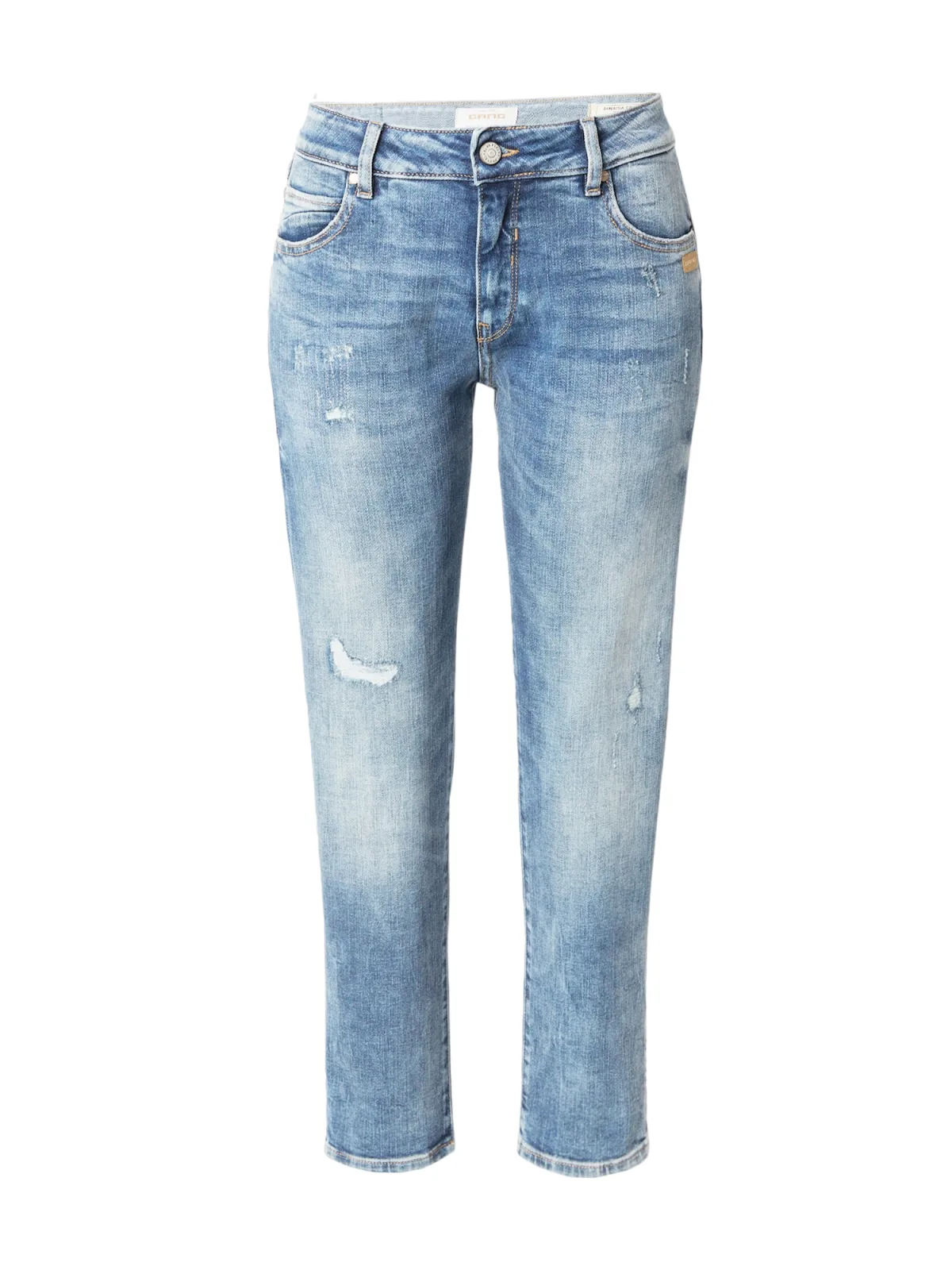 Design: Gevoerde zoom/rand, Ritssluiting, 5-pocket-style; Type sluiting: Ritssluiting; Materiaal: Denim; Motief: Effen; Extra's: Label patch/label flag, Used-look, Riemlussen; Wassing: ripped; Lengte: 7/8 lengte; Pasvorm: Regular; Taillehoogte: Mid waist