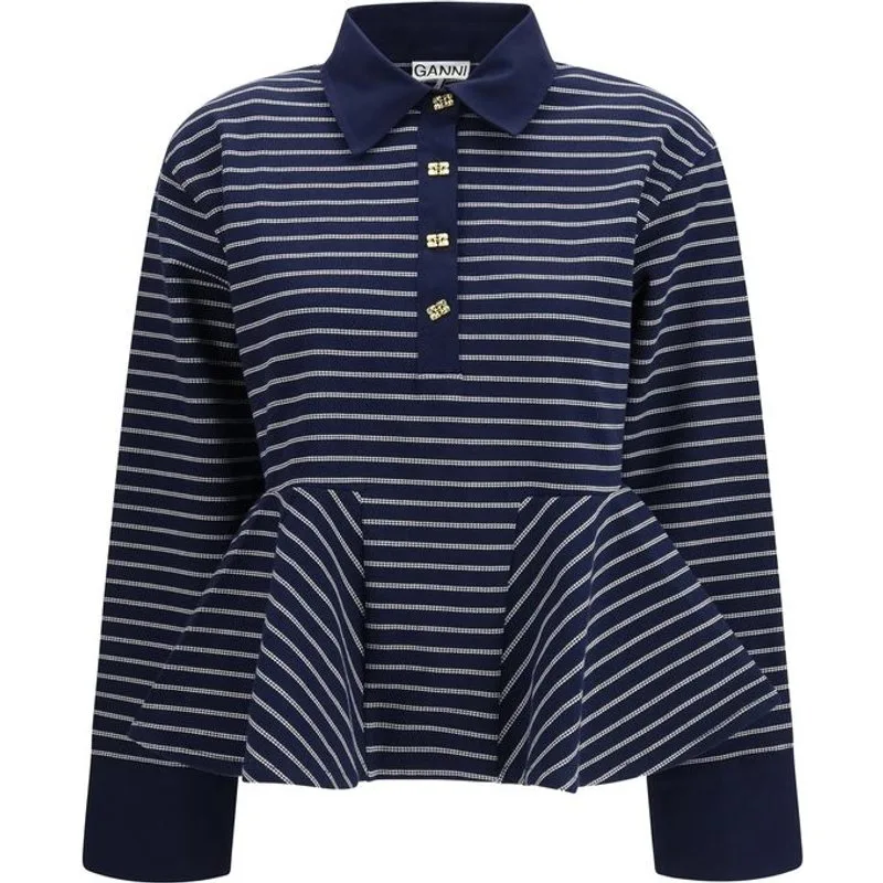 Het gestreepte Poloshirt van Ganni is een uniek kledingstuk dat de elegantie van een shirtkraag combineert met de functionaliteit van een poloshirt. De sluiting aan de voorkant met drie logo-knopen voegt een onderscheidend detail toe, terwijl het peplumontwerp een zachte en vloeiende silhouette creëert die de figuur benadrukt met een vleugje verfijning. De dunne strepen zorgen voor een dynamisch visueel effect, waardoor dit shirt een uitstekende keuze is voor wie op zoek is naar een hedendaagse en chique uitstraling, perfect voor verschillende gelegenheden. Seizoen: SS26 Pasvorm: Regular Samenstelling: 100% Katoen