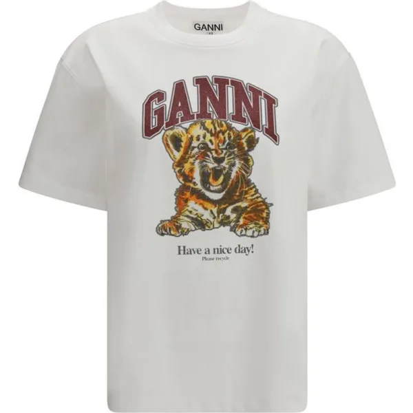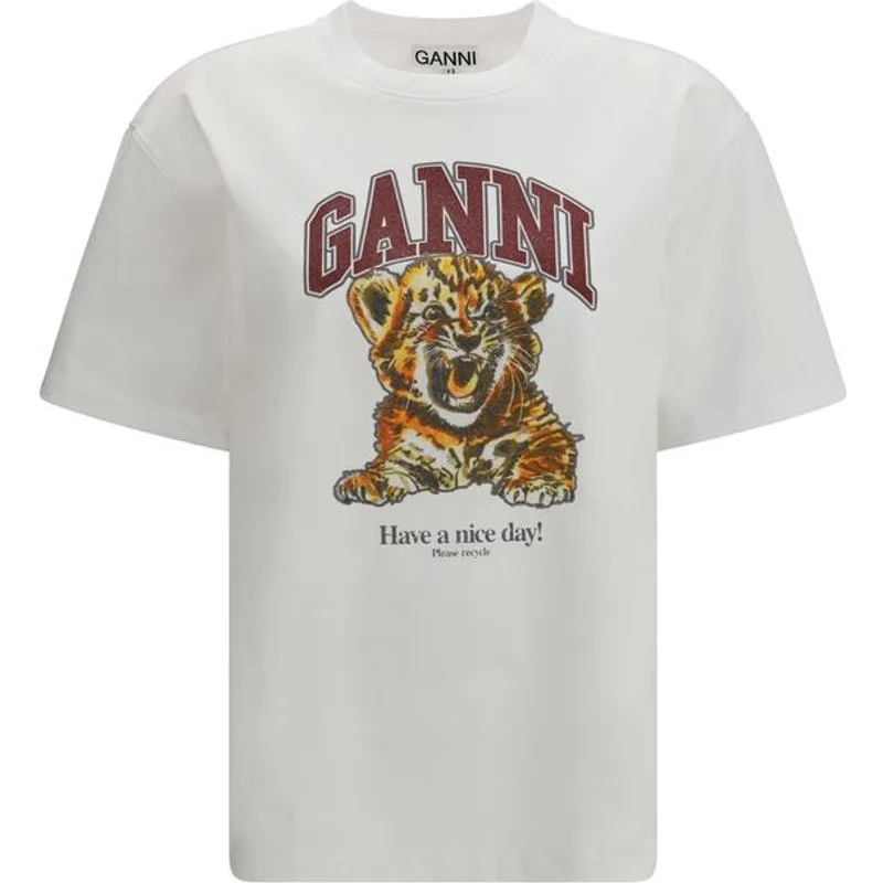 Het Beaded Tiger T-shirt van Ganni is een casual-chic stuk met een vleugje originaliteit. De ronde halslijn en korte mouwen zorgen voor een eenvoudige en veelzijdige uitstraling, terwijl de grafische print van een tijger versierd met kralen een uniek en opvallend detail toevoegt. Het GANNI-logo en de boodschap 'Have a nice day! Please recycle' maken het ontwerp compleet en brengen een positieve en duurzame toets aan je garderobe. Perfect voor een frisse en moderne look, ideaal voor wie houdt van een mix van comfort en stijl. Seizoen: SS26 Pasvorm: Regular Samenstelling: 100% Katoen