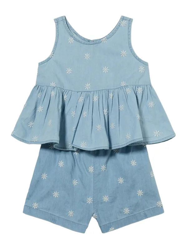 Design: Gevoerde zoom/rand, Flare, Elastische taille/zoom, Keyholesluiting; Type sluiting: Knoopsluiting; Materiaal: Denim; Motief: Bloemenprint; Extra's: All-over patroon, Vaste grip; Aantal per set: 2-delig; Lengte: Kort/mini; Setinhalt Kleidung: Shirt, Hose; Pasvorm: Normale pasvorm; Armlengte: Mouwloos