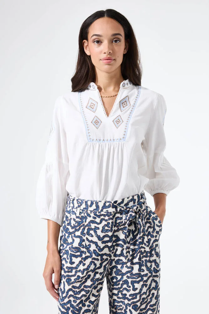 Blouse met borduursels. Deze blouse heeft een V-hals, lange mouwen en een regular fit. Dit item is gemaakt van 90% katoen en 10% linnen, wat zorgt voor een comfortabele en ademende draagervaring. Better Cotton is een initiatief dat zich wereldwijd inzet voor betere omstandigheden in de katoenindustrie.