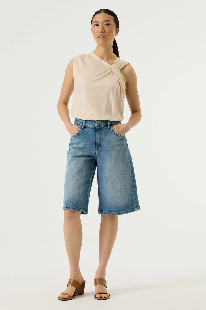 Bermuda met wijde broekspijpen. Deze bermuda heeft een hoge taille, een knoop- en ritssluiting en een wide fit. Dit item is gemaakt van 79% katoen, 20% gerecycled katoen en 1% elastaan. Better Cotton is een initiatief dat zich wereldwijd inzet voor betere omstandigheden in de katoenindustrie. Hergebruik van materialen draagt bij aan een circulaire economie.