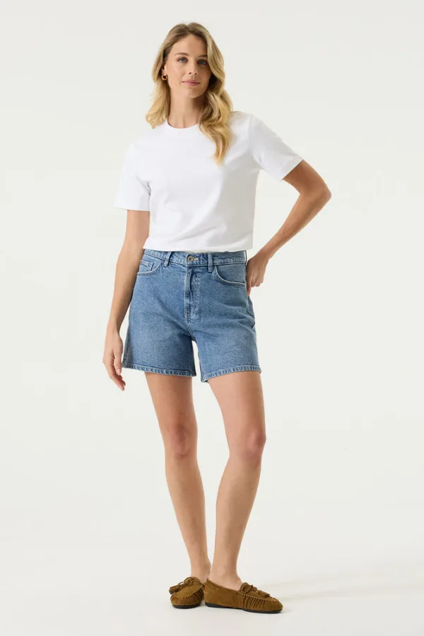 Klassieke 5-pocket denim short. Deze short heeft een high waist, een knoop- en ritssluiting en een mom fit. Dit item is gemaakt van 79% katoen, 20% gerecycled katoen en 1% elastaan. Better Cotton is een initiatief dat zich wereldwijd inzet voor betere omstandigheden in de katoenindustrie. Hergebruik van materialen draagt bij aan een circulaire economie.