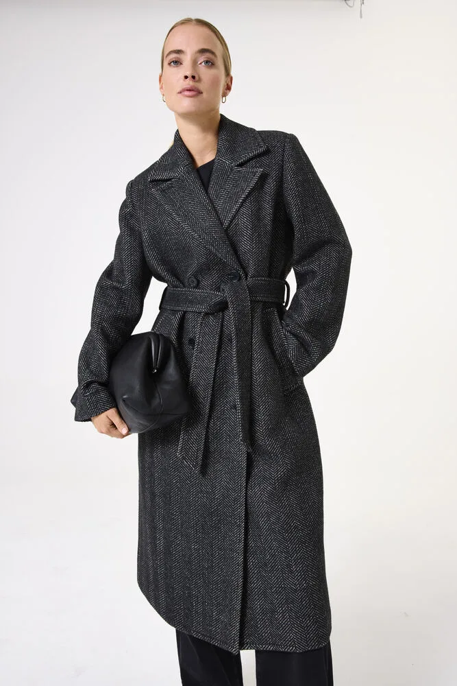 Lange mantel in een elegante herringbone stof. Deze jas heeft een dubbele knoopsluiting met tailleceintuur, lange mouwen, een kraag en een relaxed fit, waardoor hij perfect is voor zowel casual als formele gelegenheden. De buitenlaag van deze jas is gemaakt van 60% polyester en 40% wol.