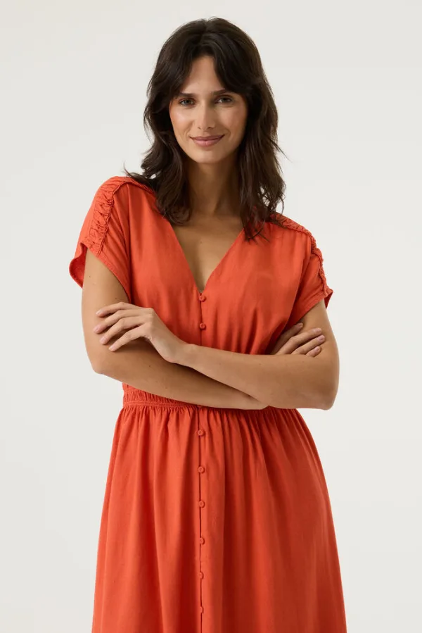 Geef je garderobe een frisse update met deze Garcia oranje midi jurk. De jurk heeft een luchtige A-lijn pasvorm die soepel langs het lichaam valt en een middellange lengte die net over de knie komt. De effen oranje kleur zorgt voor een heldere, moderne look, ideaal voor een gewone werkdag, een etentje of een dag in de stad.Luchtige pasvorm met vrouwelijke details A-lijn model dat licht uitloopt en daardoor comfortabel rond heupen en benen valt Midi lengte voor een toegankelijke, eigentijdse uitstraling Korte, rechte mouwen die prettig zijn op warmere dagen V-hals die het bovenlijf optisch verlengt Elastische inzet in de taille met smockwerk voor een subtiele taille-accent Knoopdetail en plooien aan de bovenkant voor een rustige, doch speelse structuur Gemaakt van viscose en linnen, een soepele en luchtige combinatie met een natuurlijke touch Effen ontwerp zonder zakken voor een strakke, rustige lookIdeaal voor dagelijks gebruikDeze jurk uit de Daily collectie is gemaakt voor dagen waarop je iets gekleders wilt dragen dat toch makkelijk aanvoelt. Combineer met sneakers voor een relaxte look of met sandalen voor een meer geklede uitstraling.Garcia: casual met een moderne twistGarcia brengt casual mode met een toegankelijke, eigentijdse stijl. De collecties zijn ontworpen om makkelijk te combineren te zijn, met comfortabele pasvormen en doordachte details. Zo voeg je met deze jurk eenvoudig een veelzijdig item toe aan je dagelijkse garderobe.Een comfortabele keuze voor dagen waarop je er verzorgd uit wilt zien zonder veel na te denken over je outfit.
