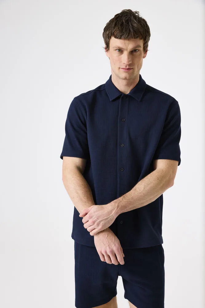 Overhemd met waffelstructuur. Een item als deze hoort thuis in elke herengarderobe! Dit overhemd heeft korte mouwen, een knoopsluiting, een kraagje en een relaxed fit. Dit item is gemaakt van 59% katoen, 36% polyester en 5% elastaan. Better Cotton is een initiatief dat zich wereldwijd inzet voor betere omstandigheden in de katoenindustrie.