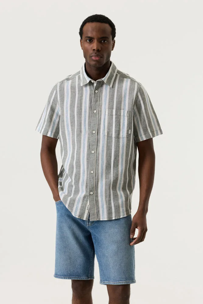 Gestreept overhemd met borstzakje. Dit overhemd heeft korte mouwen, een kraagje en een regular fit. Dit item is gemaakt van 70% katoen en 30% linnen, wat zorgt voor een comfortabele en ademende stof. Better Cotton is een initiatief dat zich wereldwijd inzet voor betere omstandigheden in de katoenindustrie.