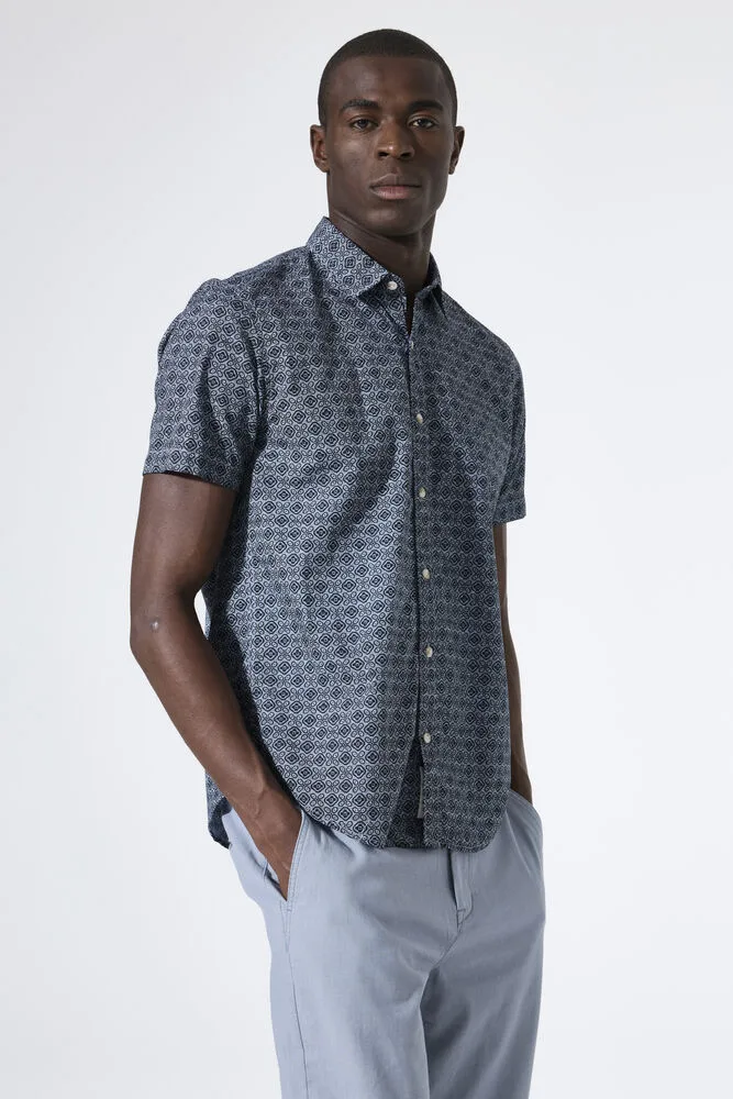 Overhemd met allover print. Dit overhemd heeft een knoopsluiting, korte mouwen en een regular fit. Dit item is gemaakt van 100% katoen, wat zorgt voor een comfortabele en ademende pasvorm. Better Cotton is een initiatief dat zich wereldwijd inzet voor betere omstandigheden in de katoenindustrie.