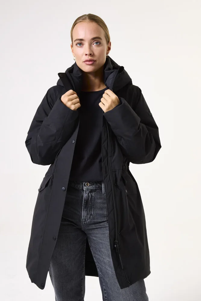 Technische parka met verstelbare taille en vrouwelijke pasvorm. Deze halflange jas is gemaakt van waterafstotend materiaal en heeft afgewerkte naden voor extra bescherming tegen regen en wind. De jas is gevoerd met een zachte vulling en heeft een comfortabele capuchon met hoge binnenkraag voor warmte en isolatie. Verder heeft deze jas een tweeweg waterdichte ritssluiting met knoopsluiting, een regular fit. De buitenlaag van deze jas is gemaakt van 100% polyester.