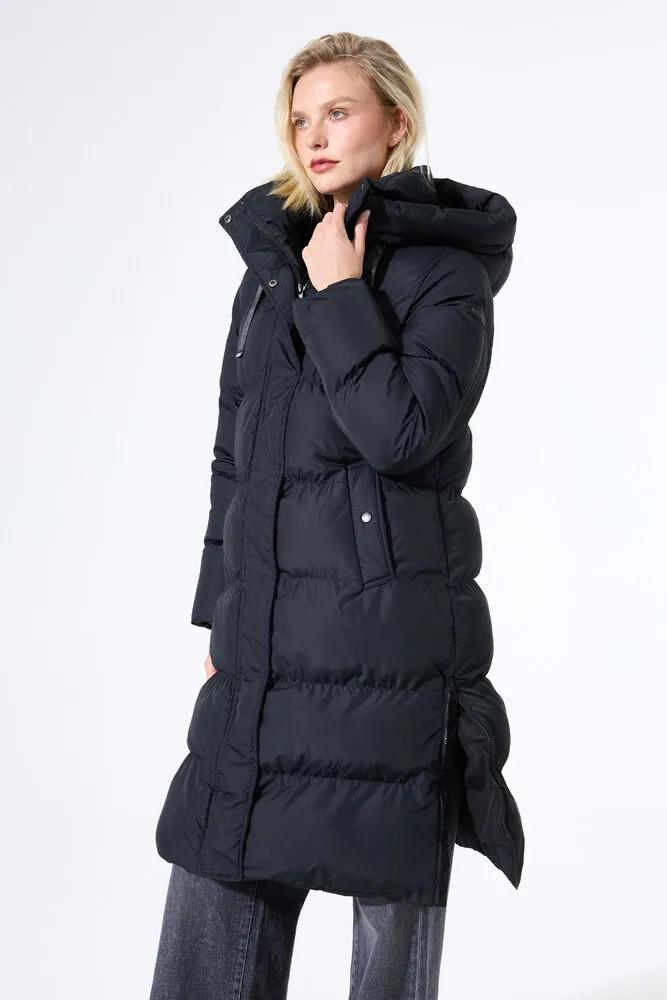 Lange gewatteerde puffer met diepe capuchon met hoge binnenkraag. Deze gewatteerde jas is gemaakt van waterafstotend materiaal en gevoerd met een zachte vulling voor comfort en warmte. Verder heeft deze jas lange mouwen, een ritssluiting, steezakken en een loose fit. De buitenlaag van deze jas is gemaakt van 100% polyester.