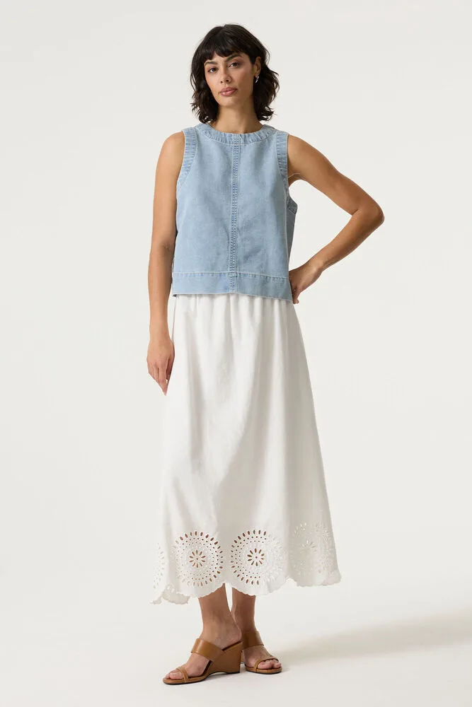 Midi rok met broderie anglaise. Deze rok heeft een elastische tailleband en een relaxed fit. Dit item is gemaakt van 90% katoen en 10% linnen, wat zorgt voor een comfortabele en ademende draagervaring. Better Cotton is een initiatief dat zich wereldwijd inzet voor betere omstandigheden in de katoenindustrie.