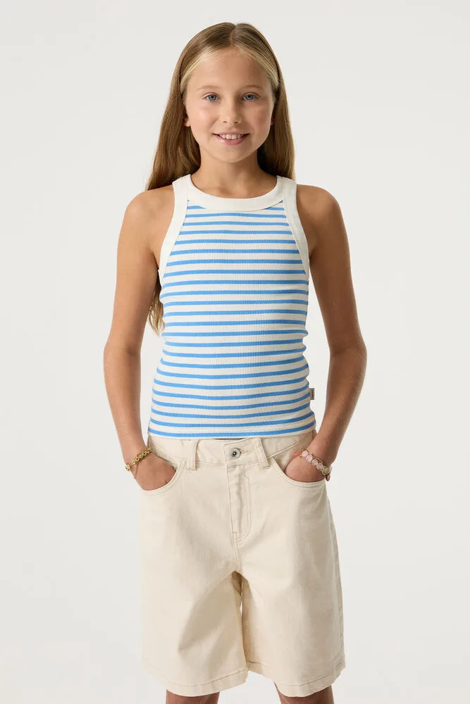 Ribstof singlet met streeppatroon. Deze singlet heeft een ronde hals en een slim fit. Dit item is gemaakt van 95% katoen en 5% elastaan, waardoor het comfortabel en elastisch is. Better Cotton is een initiatief dat zich wereldwijd inzet voor betere omstandigheden in de katoenindustrie.