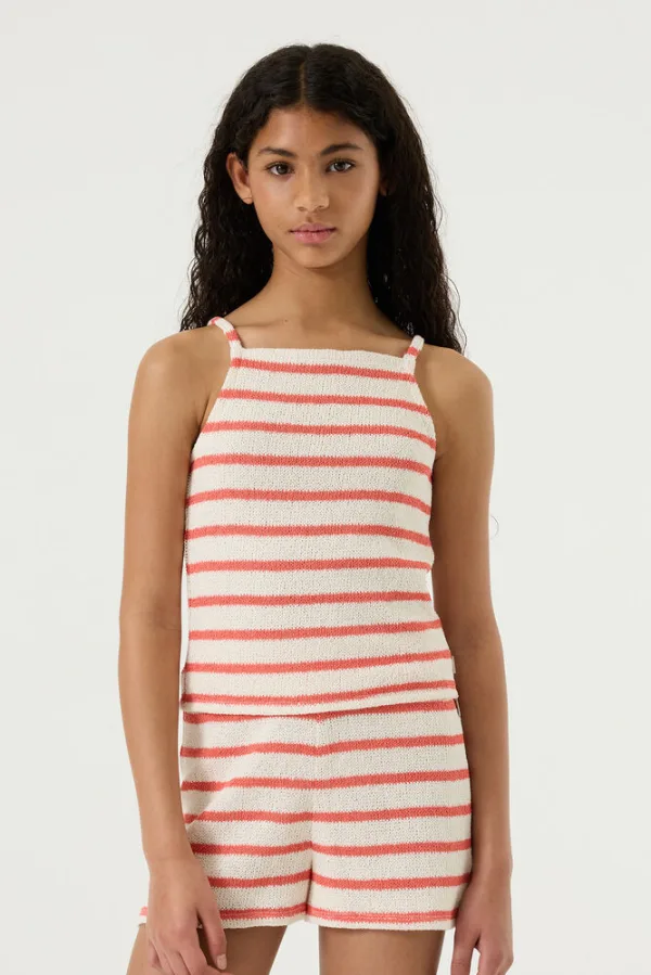 Gehaakte singlet met streeppatroon. Deze singlet heeft dunne spaghettibandjes en een regular fit. Dit item is gemaakt van 65% katoen en 35% polyester, wat zorgt voor een comfortabele en ademende stof. Better Cotton is een initiatief dat zich wereldwijd inzet voor betere omstandigheden in de katoenindustrie.