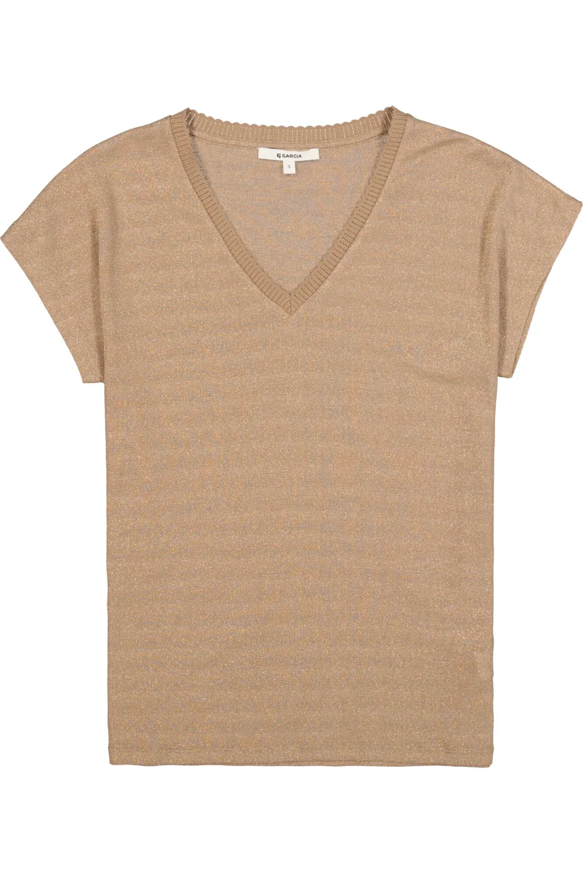 T-shirt met glitter. Dit T-shirt heeft korte mouwen, een V-hals en een regular fit. Dit item is gemaakt van 60% katoen, 25% polyester en 15% metallic garen. Better Cotton is een initiatief dat zich wereldwijd inzet voor betere omstandigheden in de katoenindustrie.