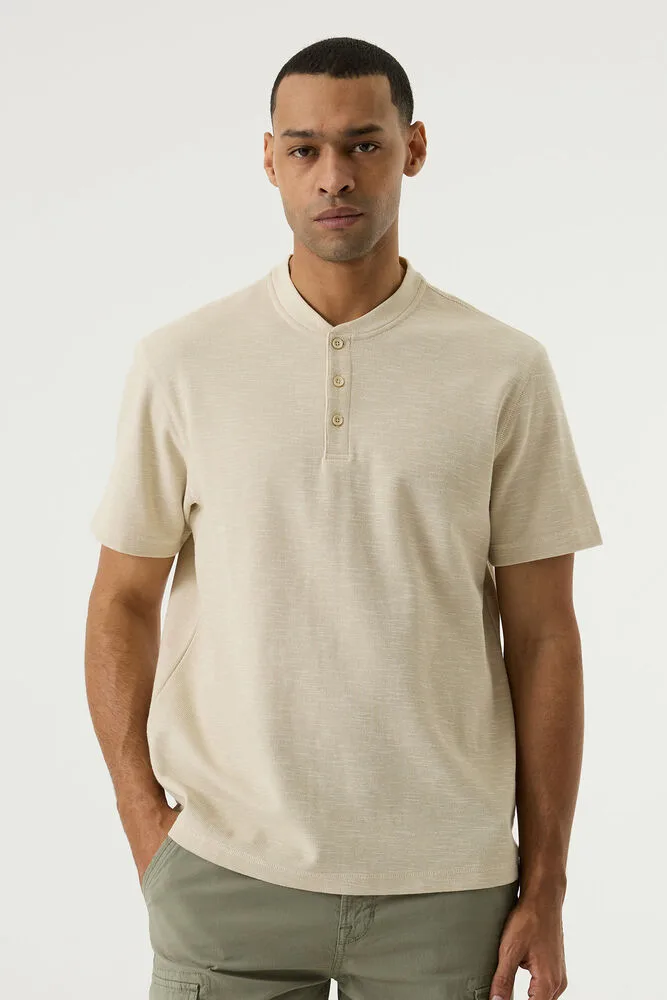T-shirt met jacquardstructuur. Dit T-shirt heeft een ronde hals, korte mouwen en een relaxed fit. Dit item is gemaakt van 73% katoen, 25% polyester en 2% elastaan. Better Cotton is een initiatief dat zich wereldwijd inzet voor betere omstandigheden in de katoenindustrie.
