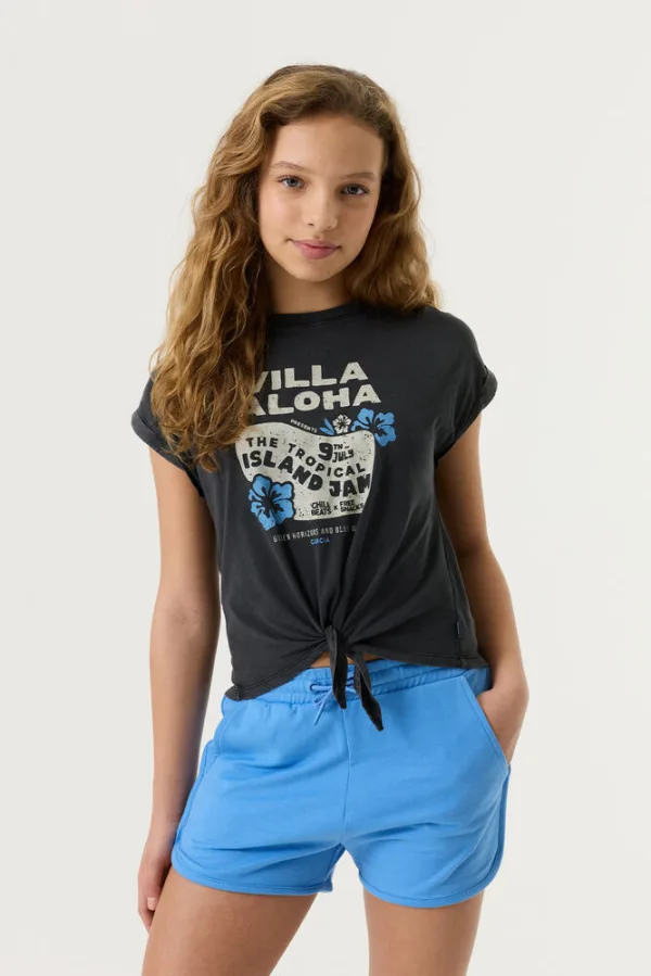 T-shirt met strikdetail en borstprint. Dit T-shirt heeft een ronde hals, korte mouwen en een regular fit. Dit item is gemaakt van 100% katoen. Better Cotton is een initiatief dat zich wereldwijd inzet voor betere omstandigheden in de katoenindustrie.