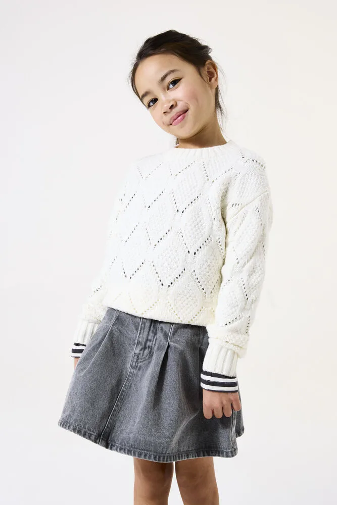Stijlvolle trui voor meisjes met een gebreid patroon. Deze trui heeft een ronde hals, lange mouwen en een regular fit. Dit item is gemaakt van 72% viscose en 28% polyester, wat zorgt voor een comfortabele en zachte draagervaring. De trui is perfect te combineren met een rok of jeans voor een trendy look.