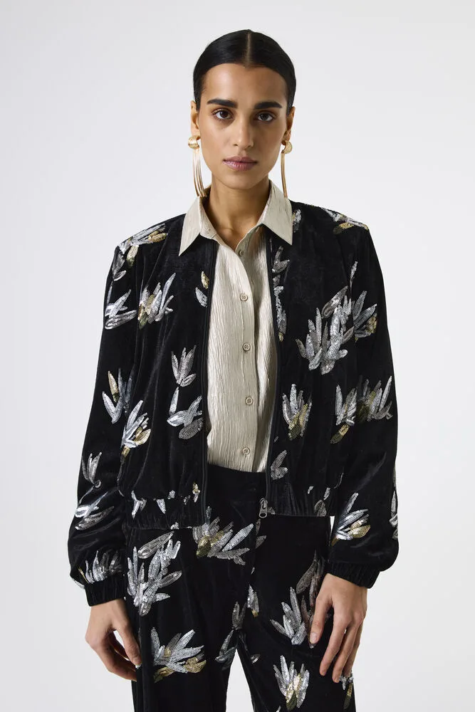 Velvet jack met pailletten. Dit jack heeft een ronde hals, lange mouwen en sluit met een ritssluiting, wat zorgt voor een comfortabele regular fit. Dit item is gemaakt van 96% polyester en 4% elastaan, waardoor het zacht aanvoelt en een luxe uitstraling heeft.