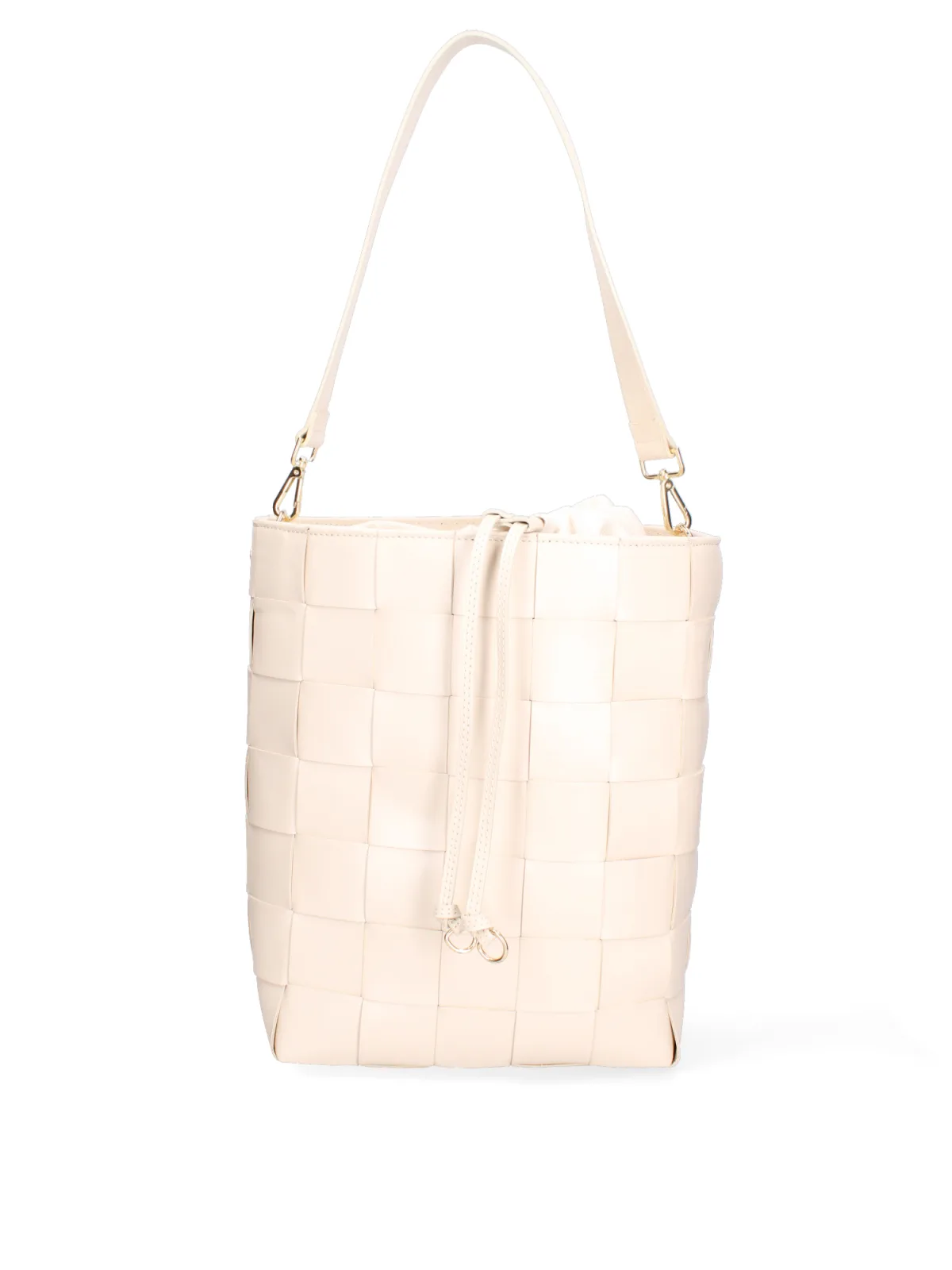 Damesschoudertas met lederen trekkoordsluiting. één open binnenzak. afwezige externe zakken. verstelbare en afneembare lederen schouderband. afneembaar leren handvat. een binnencompartiment. extern materiaal. gevoerd met 70% katoen - 30% polyester binnenkant. Afmetingen: 27x34x14 cm. Gemaakt in Italië