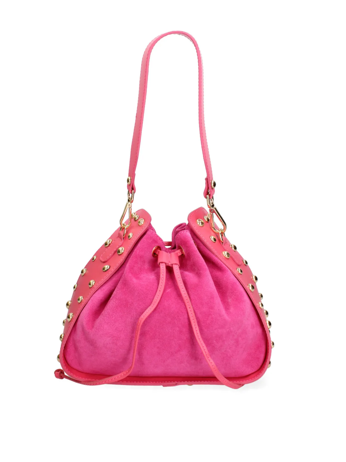 Damesschoudertas met leren trekkoordsluiting. één met binnenzakken met ritssluiting. afwezige externe zakken. in lederen schouderband. met leren handvat. een binnencompartiment. extern materiaal. gevoerd met 70% katoen - 30% polyester binnenkant. Afmetingen: 27x23x12 cm. Gemaakt in Italië