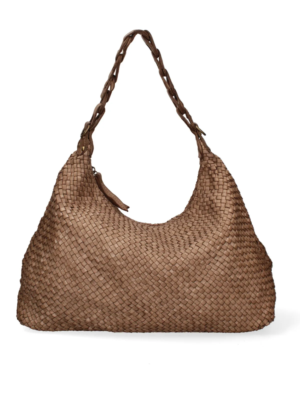Damesschoudertas met ritssluiting. één met ritssluiting en één open binnenzak. afwezige externe zakken. verstelbare en afneembare schouderband van eco-leer. met leren handvat. een binnencompartiment. extern materiaal. gevoerd met 70% katoen - 30% polyester binnenkant. Afmetingen: 46x33x15 cm. Modeproduct