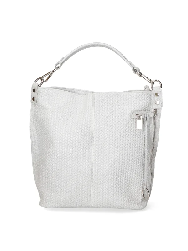 Damesschoudertas met één compartiment, zijvak, sleutelslot en verstelbare, afneembare schouderband. Italiaans handgemaakt product van echt bedrukt suède met een gevlochten effect. Gemaakt in Italië