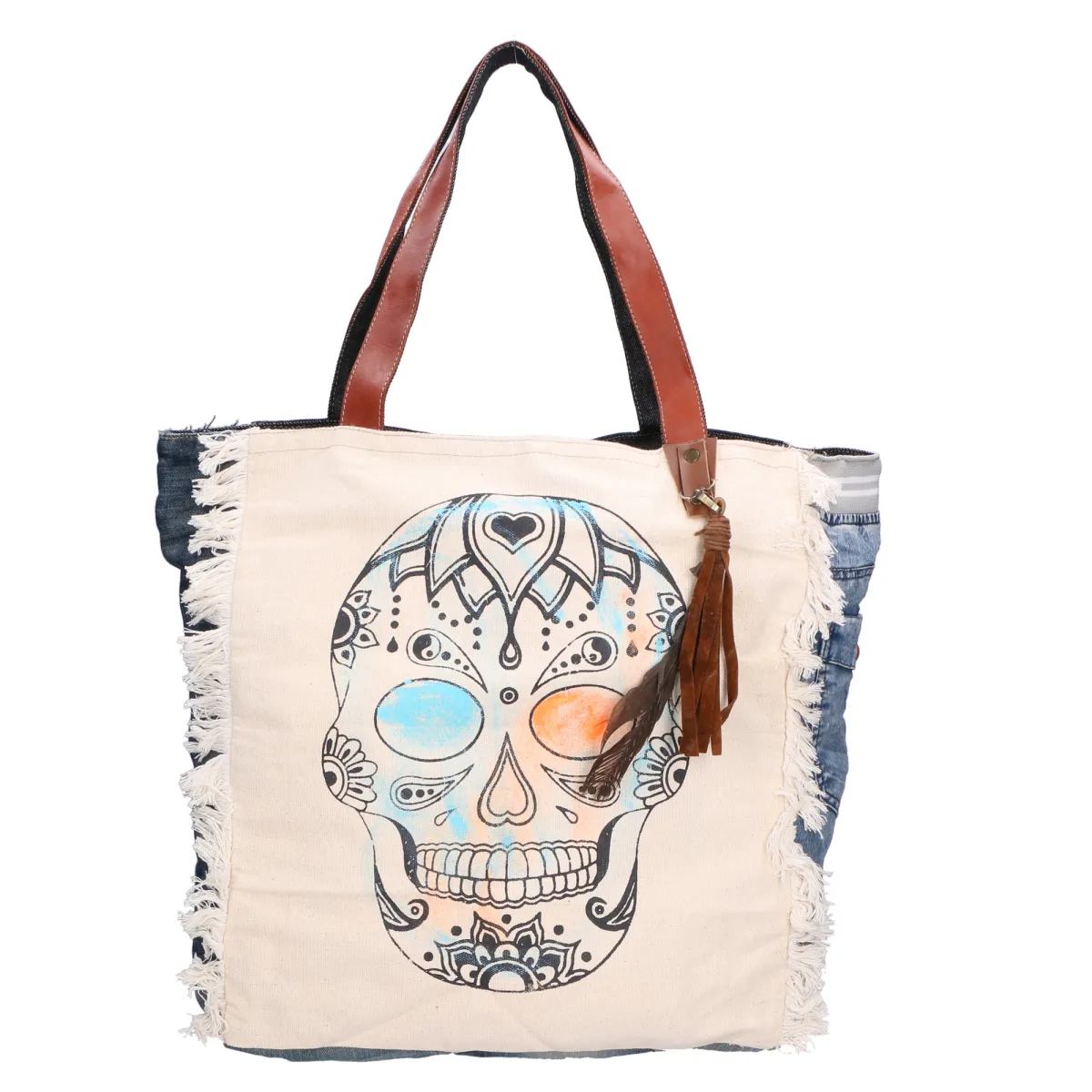 Echt leer + jeans en canvas schoudertas voor dames. Product volledig gemaakt van hergebruikte en/of gerecyclede materialen.