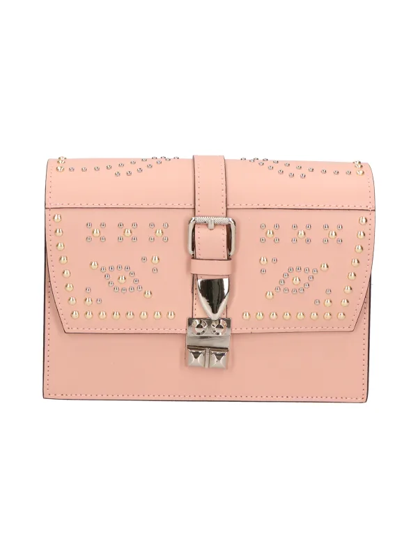 Schoudertas voor dames met één compartiment en verstelbare en afneembare leren schouderband. Klep versierd met klinknagels met platte kop, drukknoopsluiting. Binnenzak met ritssluiting. Italiaans handgemaakt product gemaakt van echte gewatteerde dol