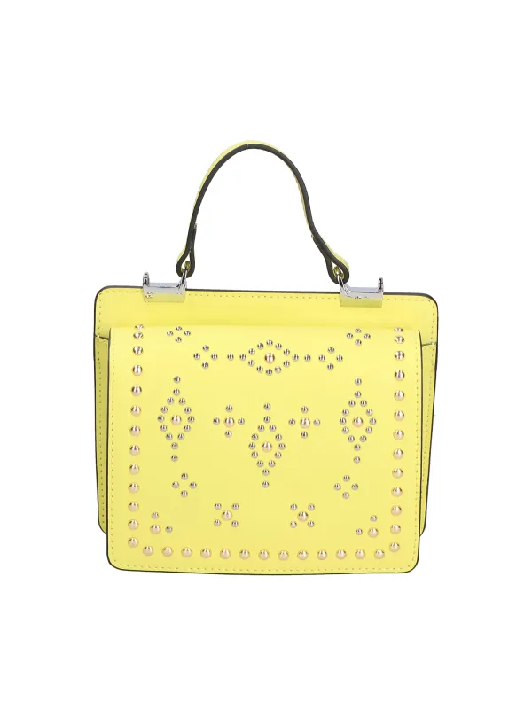 Dameshandtas met twee compartimenten, handvat en afneembare, verstelbare schouderband, voorflap met platte klinknagels op het hoofd. Italiaans handgemaakt product gemaakt van echt Ruga-leer. Gemaakt in Italië