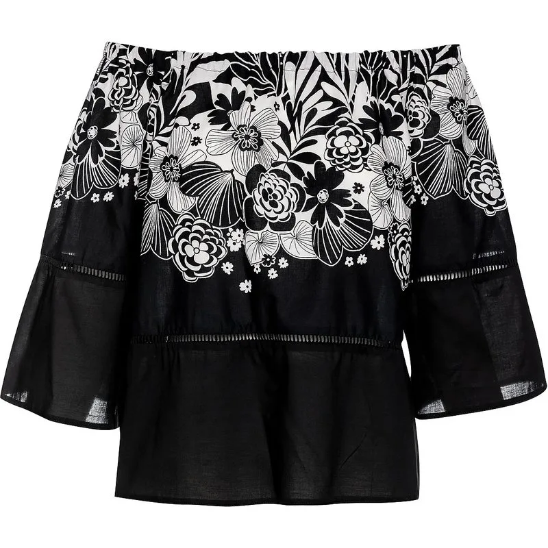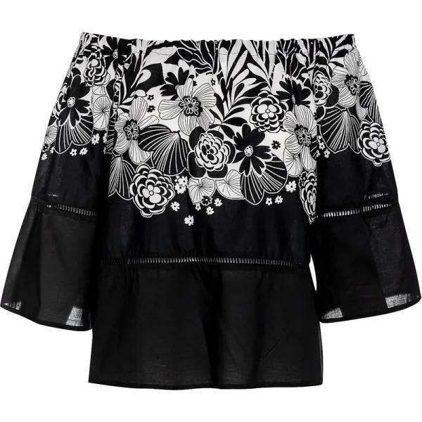 Zomertop van gebloemde stof, 100% katoen. Elastische halslijn en kan van de schouder gedragen worden. Klokmouwen in zwarte popeline met geperforeerde ecru vlecht en in de taille. A-lijn silhouet. Afmetingen voor maat S (in cm): Schouder -35; Borst-49; Taille-59; Onderkant-62; Mouwlengte-44; Lichaamslengte-47. 100% katoen.
