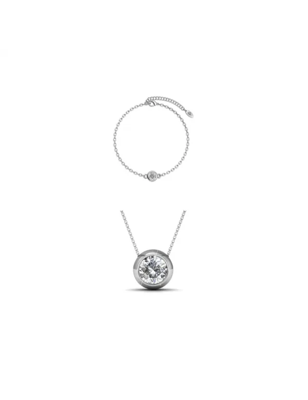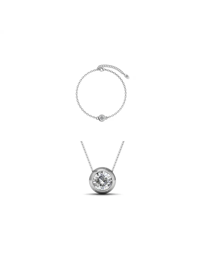 Samenstelling: Messing Afwerking: Gerhodineerd Type de Pierre : Cristal d'Autriche Aantal stenen : 2 Lengte van de armband (mm) : 180 + 55 Lengte ketting (mm): 400 + 50 Kleur steen: Kristal