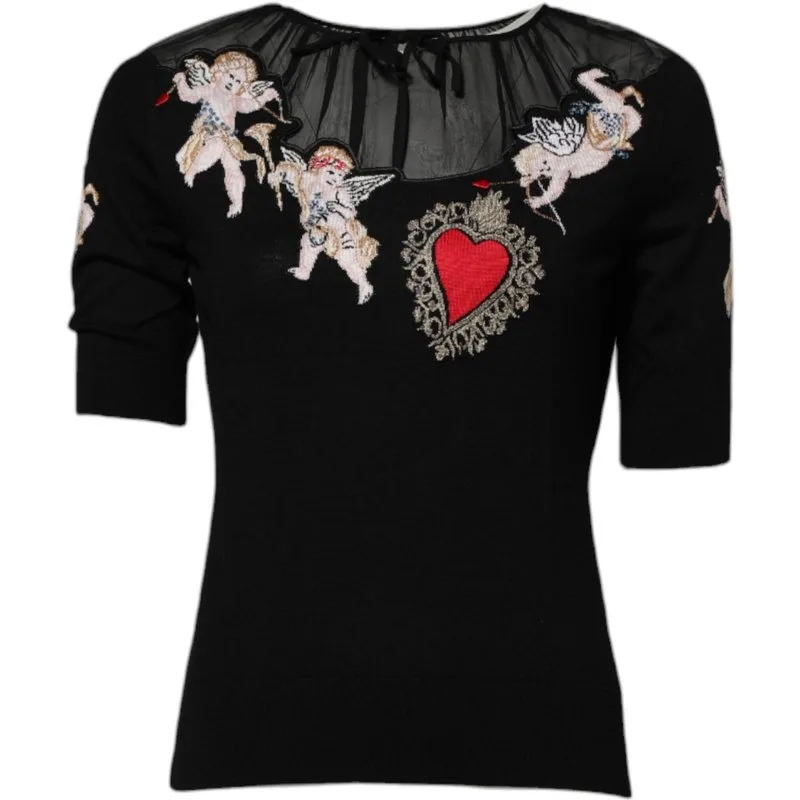 Versier jezelf, voel je goddelijk en straal elegantie uit. Dit zwarte gebreide topje voegt een vleugje hemelse charme toe aan je dagelijkse stijl. De verfijnde engel- en heilig hartenborduurwerk verheft je uitstraling en voegt een unieke, verfijnde rand toe. Ervaar het luxe gevoel van de gebreide stof tegen je huid. Moeiteloos stijlvol en gemakkelijk te dragen, dit topje gaat naadloos van dag naar nacht. Geniet van blijvende schoonheid en eenvoudig onderhoud met dit prachtige stuk. Maak een statement met een mix van comfort, duurzaamheid en iconisch design.