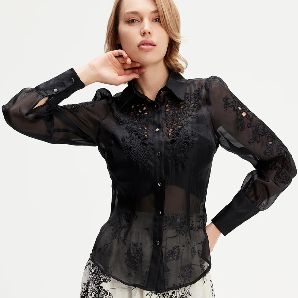 Een verfijnd stuk versierd met open werk borduurwerk op de mouwen en borstplaat. Shirt kraag, gebogen lijn voor en achter. Allemaal in een zachte, enigszins transparante organza. Om jeans te dragen of om R te passen in een meer formele rok met een kleermakersjas om naar het kantoor te gaan. Productdetails • Vorm: op maat gemaakt • Lengte: 66 cm • Kraag • Lange mouwen met brede manchetten • Midden -voorste knopen