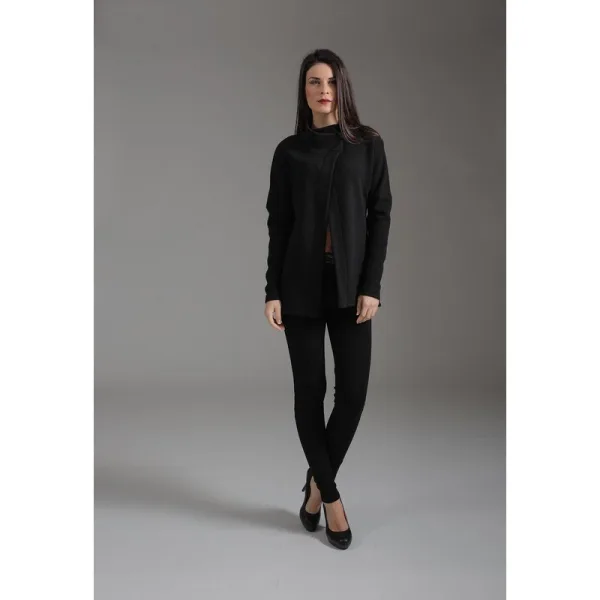 Dit jasje is gemaakt van gebreide jacquardstof. Het heeft lange vleermuismouwen en sluit asymmetrisch met een knoop aan de buitenkant en een knoop aan de binnenkant. De jas valt iets open aan de voorkant.