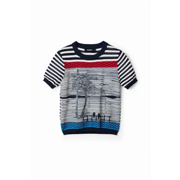 Gebreid T-shirt met korte mouwen en glanzende strepen, versierd met friezen en een motief van een tropisch landschap.Klassieke pasvormGebreid marinestreepje met tropisch landschapsmotiefRonde halsKorte mouwenGeplooide mouwen en geribde onderkantWe zijn er trots op deel uit te maken van het Better Cotton Initiative. Door katoenen kleding te kopen van Desigual steunen we een duurzamere katoenteelt.