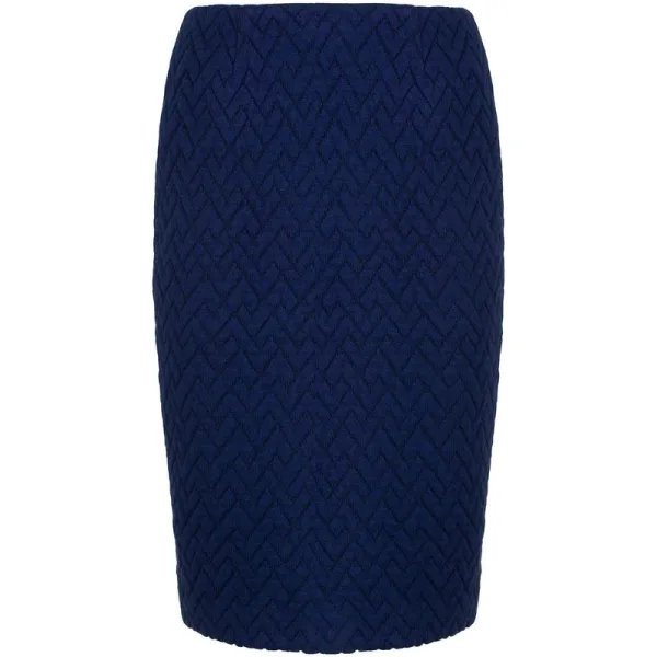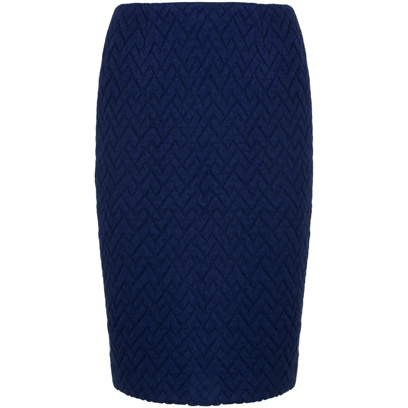 Deze knielange kokerrok is gemaakt van gebreide jacquardstof. Hij sluit aan de achterkant met een verborgen ritssluiting. De rok is gevoerd.