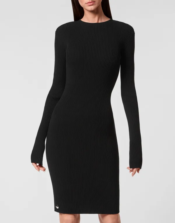 Vier je figuur met deze platte ribgebreide stretch rayon jurk met extra lange mouwen. Bekijk de open rug met kruisende bandjes en de verlaagde details.