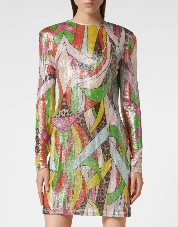 Laat je verleiden door deze Diva-look: we hebben hem ontworpen om je zomer kleur te geven. Bekijk hoe u deze mini-jurk kunt dragen als strandjurk of voor een cocktail op het strand. Multicolor gebreide lurex viscose jersey met patchprint Kruislingse band op open rug Tweenaaldsstiksels