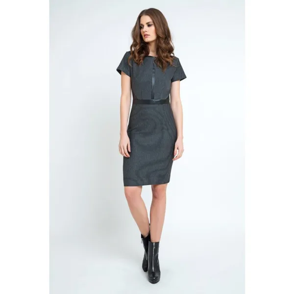 Jurk van gestreepte gebreide stretchstof. Een ronde halslijn en korte kapmouwtjes. Sierrand van 2 cm van pleer aan de halslijn. Decoratief verticaal paneel aan de voorkant vanaf de halslijn tot aan de taille. 3,5 cm leer in de tailleband. Verticale naden voor en achter. Darts bij de buste voor een perfecte pasvorm. Klein splitje achteraan. Volledig gevoerd. Lengte voor maat 38: 99cm.Ons model is 178cm en draagt maat 36.