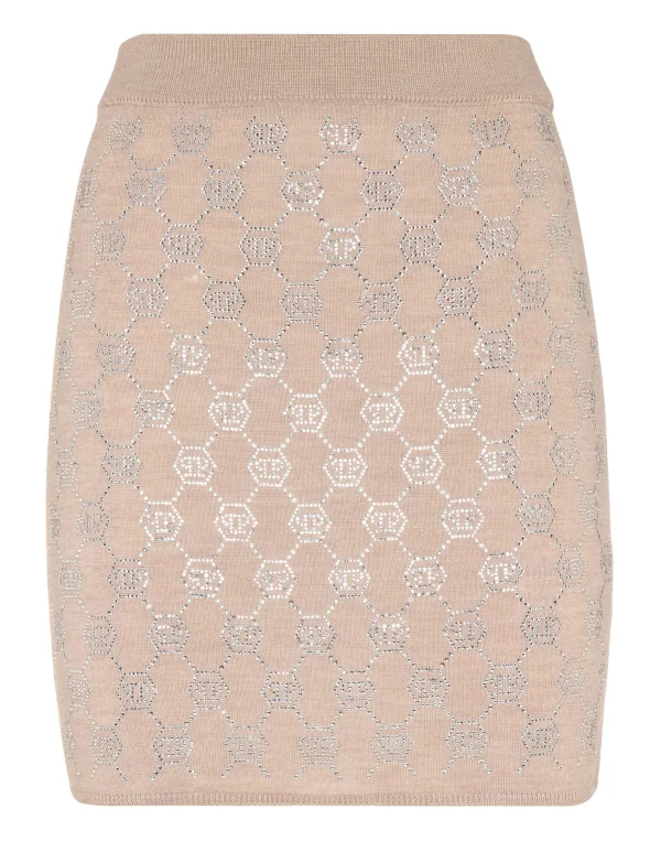 Verfraaid This knit mini-skirt is a tale of style made from a wool yarn. Find out more. Knit wool yarn Schmucksteinbesetzter Monogram all over Rib knit hems Figure fitting