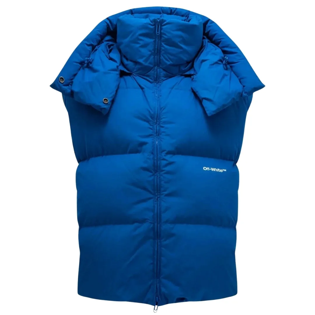 Blijf warm en stijlvol in de Off-White Blue Gilet. Deze luxe bodywarmer is gemaakt van lichtgewicht, geisoleerde stof die warmte vasthoudt en beschermt tegen de elementen. Geef stijl niet op voor comfort - maak een statement!, Vulling: 100% eendendons, Bovenmateriaal: 100% polyester, Normale pasvorm, Ritssluiting, Blauw, Effen bodywarmer, Blauw bodywarmer